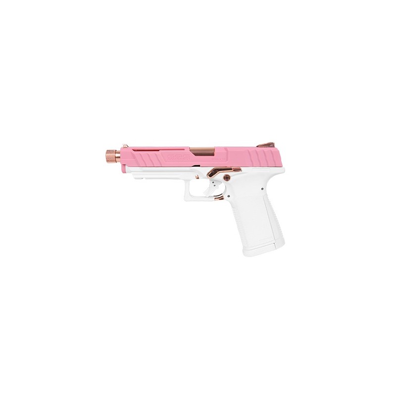 G&G propose ici une superbe réplique, déclinée en version blanche et culasse rose, avec un système interne breveté, il en résulte une faible déperdition de gaz et une excellente autonomie, même par temps froids.